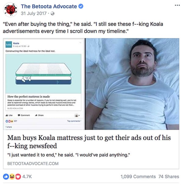 Racing fans aren't prime candidates to be Koala fans, but we had a cool idea to promote our Sofa's 4-minute assembly. Then we went hard targeting Australian racing fans, who loved it. Then we widened the net to the rest of Australia once it had plenty of likes and shares.